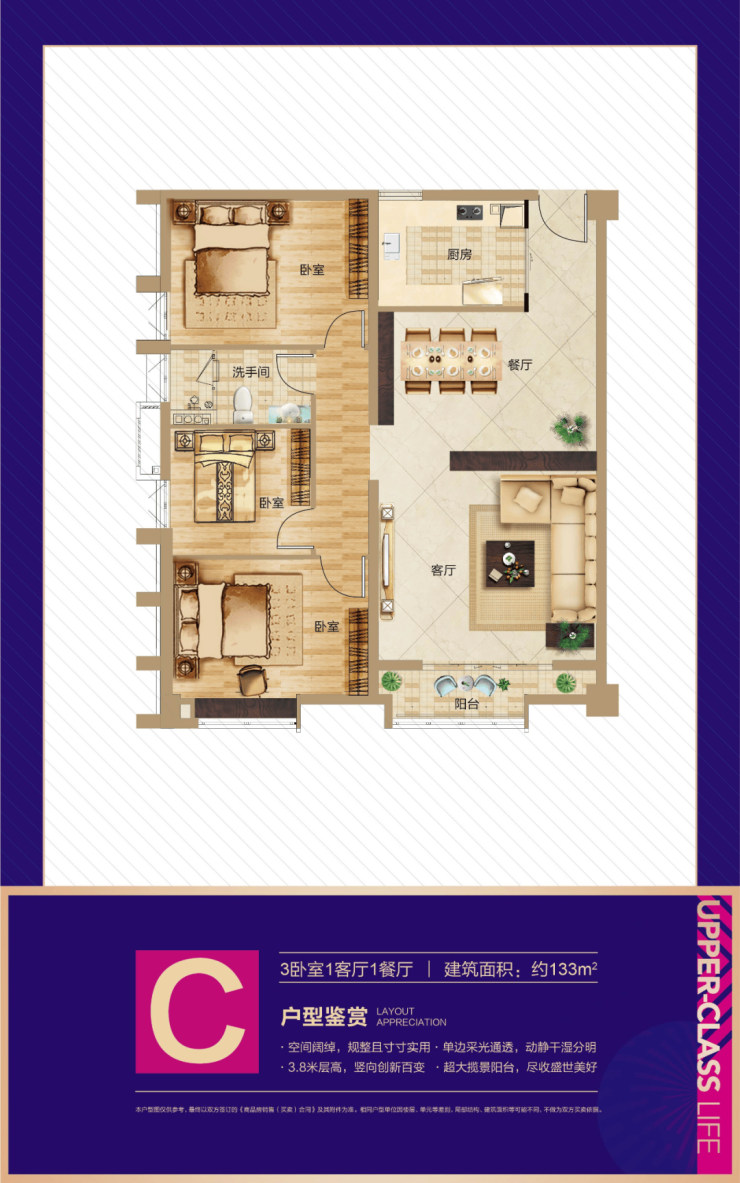 约133㎡阔景平层: 作为项目的旗舰户型,它面向的是对空间、视野和生活品质有更高要求的精英家庭。拥有阔绰的客厅开间、独立餐厅、多个卧室(通常为三房或四房),并可能配备步入式衣帽间、观景大阳台甚至多功能房。它为家庭成员提供了各自独立的私密空间,又保留了大家庭欢聚的宽敞公区,足以满足多代同堂、二胎家庭或居家办公等多种高端生活场景。位于高区的房源,更能将城市景观尽收眼底,彰显身份与格调。