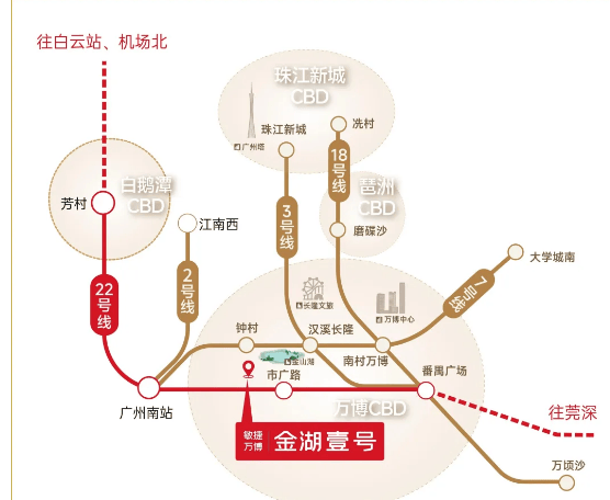 敏捷・万博金湖壹号地处番禺核心区域,交通与商业配套优势显著。交通方面,项目紧邻 22 号线市广路地铁站(已开通,直线距离约 800 米),未来还将衔接规划中的 26 号线,形成双地铁交汇格局。通过 22 号线,1 站可达番禺广场、2 站至万博中心、3 站到琶洲 CBD、4 站直达珠江新城,轻松融入广州核心生活圈;周边更有 “五横五纵” 立体路网,搭配项目旁规划的公交首末站与现有 8 条公交线路,自驾与公共出行皆便捷。