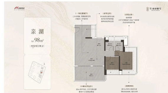 项目主打建面约 98-148㎡全南向户型,涵盖三房与四房,适配刚需到改善不同家庭结构。户型设计遵循 “高使用率、全明通透” 原则,使用率约 100-110%,部分飘窗可打掉 50cm 保留 30cm,进一步拓展实用空间。