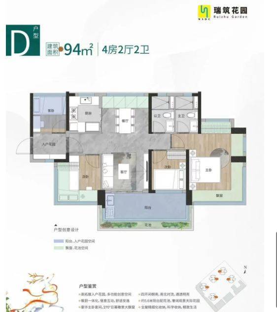 94㎡户型为 4 房 2 厅 2 卫,带有高拓展入户花园,四开间朝南且南北对流,主卧套房设计并配备 270° 瞰景飘窗,满足家庭对空间和品质的需求。售楼处电话:4009909752。