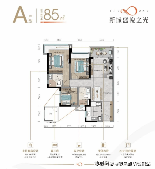 85㎡三房两厅两卫户型,是刚需群体的优选户型。该户型格局方正,南北通透,采光通风效果好,客厅连接景观阳台,延伸室内空间的同时,可欣赏社区园林美景;三个卧室布局合理,空间大小适中,主卧配备独立卫生间,保证业主隐私;厨房采用L型设计,操作空间充足,方便日常烹饪;卫生间干湿分离,保持室内整洁干燥,整体户型紧凑实用,没有浪费空间,完美满足三口之家的日常居住需求。