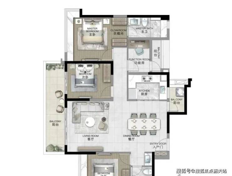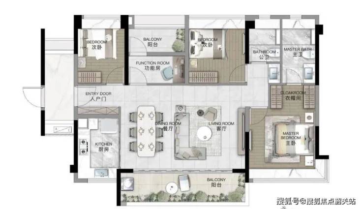 116㎡ 3+1房:U型厨房+6.4米南向阳台,南北通透,次卧可改造为书房或儿童房,满足二孩家庭需求;