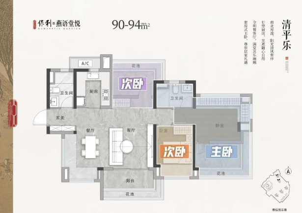 约90㎡横厅三房:客餐厅开间约6米(含飘窗),主卧设270°飘窗,采光与视野俱佳;