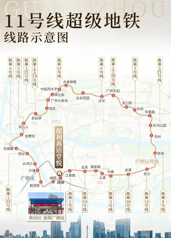 从项目步行至燕岗地铁站不足200米,真正实现“地铁上盖”。该站为广佛线与广州地铁11号线(已开通)的换乘枢纽,出行选择极为灵活: