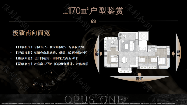 除了超高实用率,保利珠江天悦的户型设计也极具优势,所有户型均采用板楼布局,楼栋45°偏转,实现户户望江,部分户型拥有270°环幕江