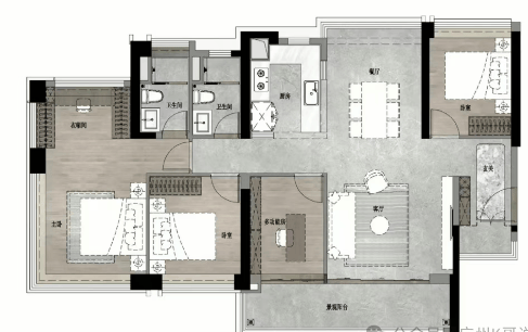 105㎡四房两厅两卫:五开间朝南,全屋南北对流,增加X空间以供互动陪伴。