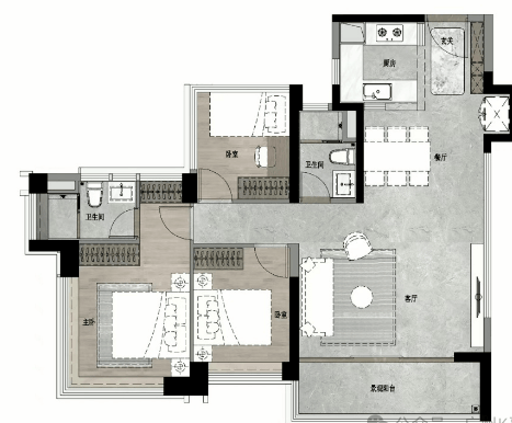 88㎡三房两厅两卫:客厅开间达5.2米,拥有270°景观阳台。