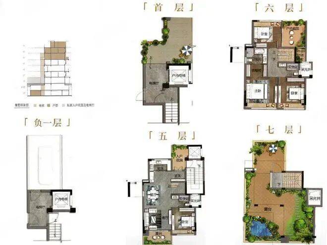 低密滨水墅级住区:项目采用“隽系”产品理念,提供天地墅叠墅和空中墅复式洋房等多种户型选择。
