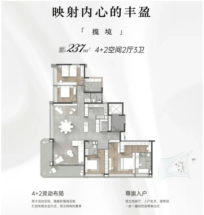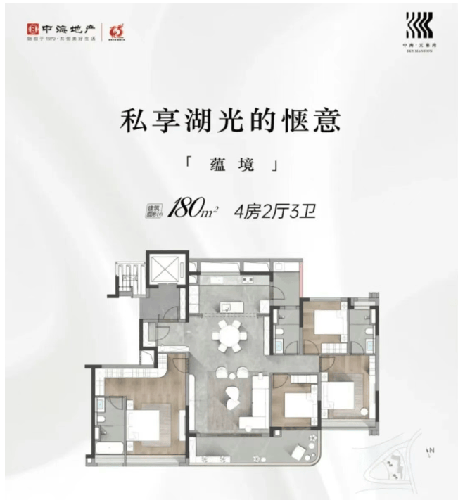 天幕湾产品极为纯粹:仅推出180㎡与237㎡两种大平层户型,全部为南北通透、四房及以上格局。180㎡户型主打“奢阔四房+双主卧套房”,适合三代同堂或二胎家庭;237㎡则配备独立家政间、超大LDK一体化空间及270°转角观景阳台,直面中心湖景,堪称“湖居大宅”。得益于2梯2户设计,每户均享独立玄关与电梯前室,隐私性拉满。93%的得房率意味着公摊极小,实际使用面积远超同面积段竞品。例如,237㎡户型实际得房约220㎡,相当于市面上260㎡产品的实用感。这种“去套路化”的产品思维,正是中海对高端客群需求的精准回应——不玩花样,只做极致舒适。