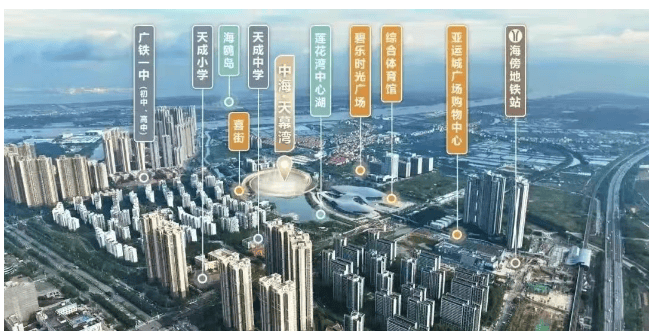 中海天幕湾并非泛泛之辈,它落子于番禺南亚运城板块的“黄金眼位”——体育馆东侧的岛尖地带。这个位置有多珍贵?北接喜街繁华烟火,南拥中心湖270°环幕水景,西望国际级综合体育馆,东连未来高铁枢纽,真正实现了“出则繁华、入则静谧”的理想人居格局。更重要的是,它并非孤立开发,而是作为中海亚运城十年深耕后的全新压轴组团,承接了整个片区最成熟的配套与最稀缺的景观资源。在亚运城已开发超80%的背景下,天幕湾所在的岛尖地块,是区域内最后一块可成片开发的临湖低密住宅用地。这种“核心中的核心”区位,在广州近郊新盘中实属罕见,更别说还紧邻地铁口——步行几百米即达海傍站,堪称“离尘不离城”的典范。