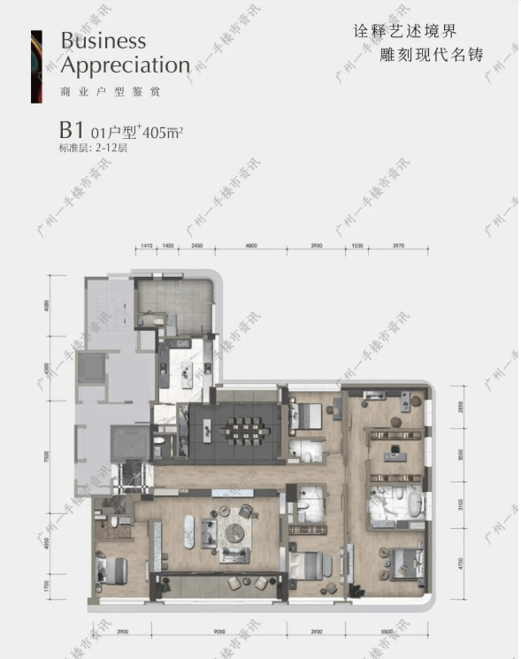 322-405㎡四房公寓户型,专为高端商务人士打造,兼顾了居住与商务功能,空间阔绰,布局合理,江景视野极佳。户型南向望江,五面瞰江视野,部分户型拥有270°IMAX巨幕江景,推窗即见珠江盛景与城市地标,彰显高端商务人士的品味与身份。客厅采用超大面宽设计,空间开阔通透,连接景观阳台,江风与阳光自由穿梭,无论是商务接待、客户洽谈,还是家庭休闲,都能轻松满足;四个卧室均为全套房设计,空间宽敞舒适,配备独立卫生间、衣帽间,自带景观飘窗,让每一位居住者都能享受独立的私密空间与江景美景;主卧奢华大气,超大空间布局,配备独立卫浴、步入式衣帽间、景观露台,尽显主人的尊贵身份;厨房采用中西双厨设计,满足不同的烹饪需求,操作空间宽敞,搭配生活阳台,实用性与美观性兼具;此外,户型还配备了独立的书房、会议室、影音室等功能空间,满足高端商务人士的办公与休闲需求,实现“居住+办公”一体化的高端生活模式。