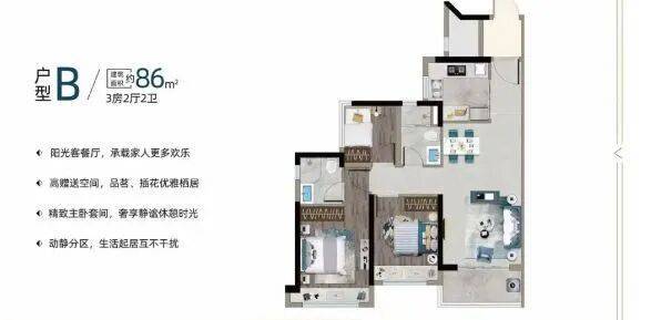86平方米三房两厅两卫:空间更为宽敞,适合追求更多私人空间的家庭。