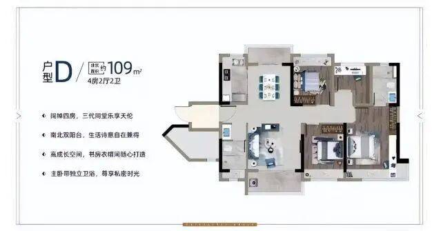 109平方米四房两厅两卫:适合大家庭居住,每个房间都有足够的私密性。