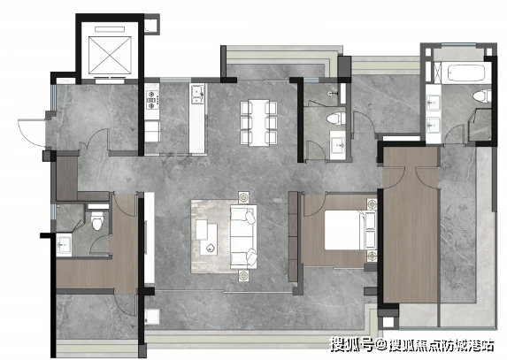 128㎡四房两卫:客厅面宽4.2米,双阳台设计(生活阳台3㎡+景观阳台7㎡),动静分区明确;