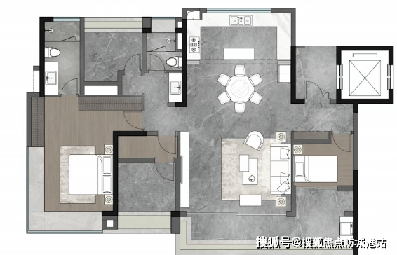 143㎡五房三卫:LDKG一体化设计,形成约60㎡“世界会客厅”;双主卧套房配备智能马桶、恒温花洒;全屋智能系统联动新风与安防。