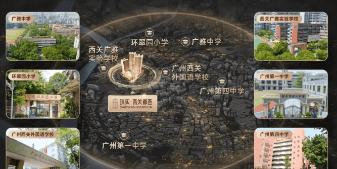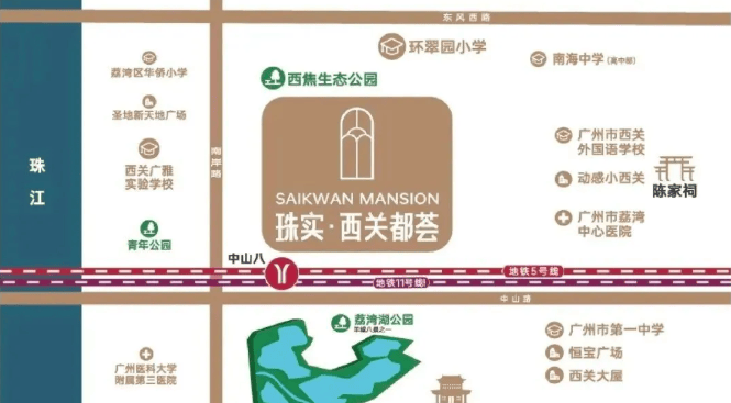 该项目距离地铁5号线仅约500米,周边还有多条公交线路汇聚,交通便利。自驾通过南岸路与中山八路交汇处,可无缝衔接中山路、东风路、环市路等城市主干道。此外,项目自身还配建了一所公立幼儿园,并且小学划分到了华侨小学环翠园校区,中学则需要派位,但涵盖了广雅中学、广州市第一中学等省级名校。