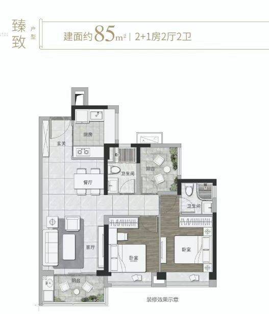 对于预算有限但又追求实用的家庭来说,85㎡的 2 + 1 实用户型是个不错的选择。高得房率使得同等面积下比其他户型多一卫,满足家庭日常使用需求,避免了早晨洗漱的拥挤。
