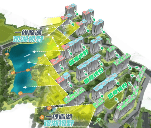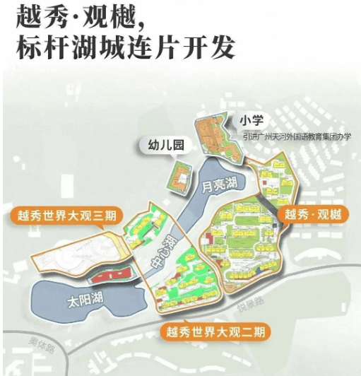 越秀观樾由国企越秀开发,自 2024 年 4 月拿下世界大观三期地块后,累计投入 126.8 亿 +,拥有近 26.5 万㎡土储,实现一二三期连片开发,规划优势显著。项目容积率仅 1.91,绿化率 35%,打造天河罕见的低密社区,建筑按 “前低后高” 梯级跌落设计,形成朝向湖区的观景优势。项目以 “配套先于居住生长” 为理念,一期主打纯住宅并完成生态修复与湖水净化,二期新增商业与运动配套,三期进一步拓展开发空间。依托 5.3 万㎡日月双湖(水域面积 3.3 万㎡太阳湖)与 1.9 公里湖岸线,打造 “环湖向阳” 的湖居社区,将湖居生活从 “少数人特权” 变为触手可及的日常。