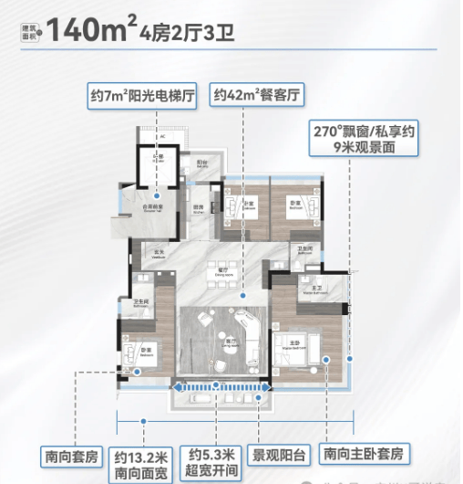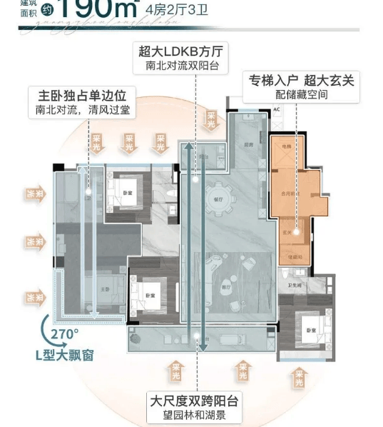 越秀观樾户型以改善型为主,整体采用低密板楼设计,舒适度高。项目分为南北两个地块,南侧地块分布 20 栋住宅,北侧地块分布 5 栋住宅,均为 45-52 米低密度小高层。一期在售户型包括建面约 140㎡“林隐” 户型、190㎡“山趣” 户型,二期规划 125㎡、140-160㎡、190㎡、250㎡等户型,另有 250㎡“湖境” 户型。户型设计亮点突出:采用 2 梯 2 户设计,部分户型相当于 1 梯 1 户,私密性强;超高使用率(按建筑新规报建,得房率优势明显),LDKG 一体化设计拓展公区空间,减少承重墙提升空间灵动性;窗地比高达 38%(远超广州常见 0.25 标准),三开间朝南,主卧配备 270° 大飘窗,部分户型享中轴园林或一线湖景,如 190㎡户型约 17 米南向面宽、250㎡户型约 18.9 米南向面宽与 15 米转角阳台,观景体验极佳。