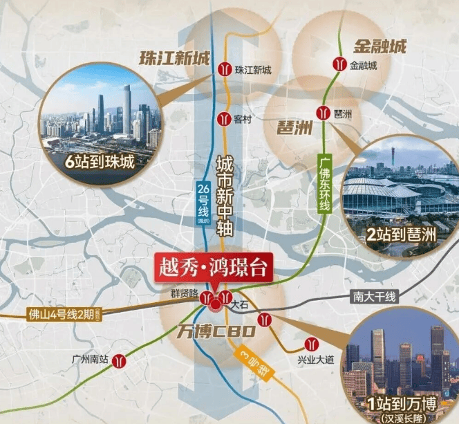 首先是地铁3号线,这条被誉为“广州第一线”的轨道交通,是连接天河、海珠与番禺的大动脉。项目距离3号线大石站步行仅约700米,这一距离在地铁房项目中属于非常优质的范围。3号线的强大运力,使得从大石出发,仅需6站即可直达珠江新城CBD,这里是广州的经济心脏,汇聚了无数顶尖企业总部与高端写字楼。对于在珠江新城工作的白领来说,住在越秀·鸿璟台,意味着每天可以少花一小时在拥挤的地铁车厢里,多出一小时陪伴家人或自我充电。此外,3号线仅需1站即可到达万博CBD,这里是广州南部的商业新中心,拥有庞大的消费人群与丰富的就业机会。无论是商务洽谈还是休闲娱乐,万博都能提供一站式服务。