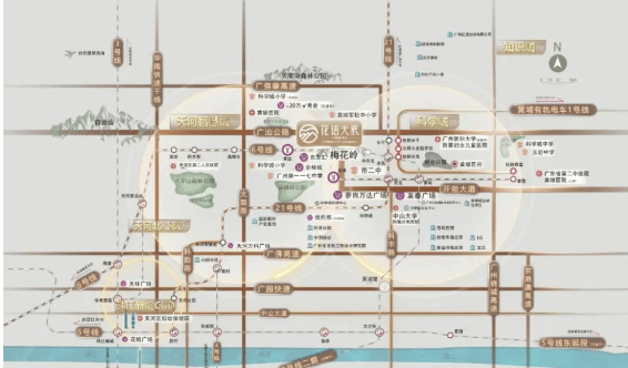 中铁建信达花语天宸位于广州市黄埔区黄陂板块,紧邻广汕公路。该项目三面环山,背靠梅花岭,距离天河直线距离仅3公里,是黄陂板块内唯一在售的南向山景小区。这种地理位置不仅提供了优美的自然景观,也为居民带来了清新的空气和宁静的生活环境。