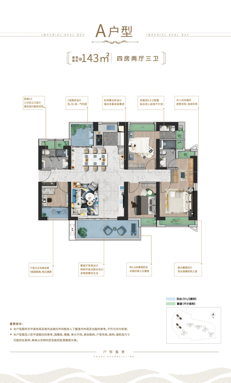 A 户型(同面积最大客厅):户型方正,3.1 米层高,5 米超宽客餐厅,4 面宽朝南、南北通透,5.8 米 270 度奢阔阳台(1.7 米大进深),三分区公卫融合家政空间,空间感与实用性兼具;