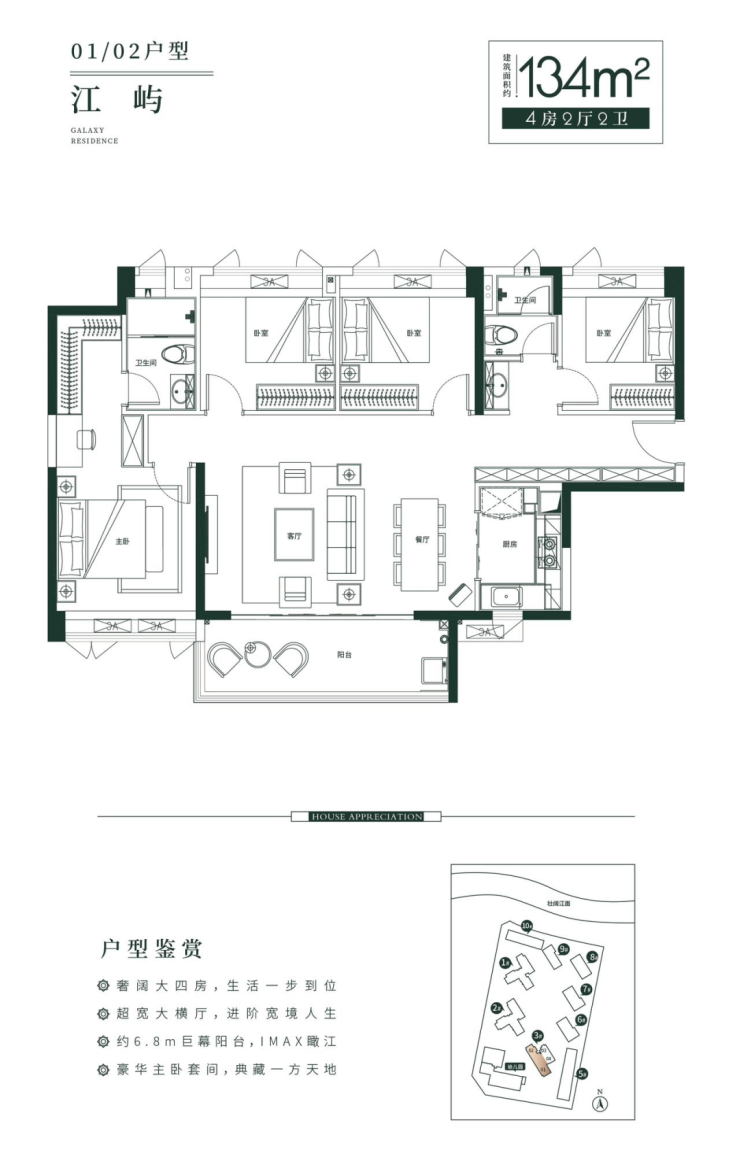 首推建面约99-134平方米的三至四房户型,精准契合改善型家庭需求。其中,约99㎡三房两厅两卫户型,采用经典竖厅布局,方正实用;约6.2米阔景阳台直面江岸,U型厨房动线流畅,主卧套房私密尊享。而约134㎡四房两厅两卫户型,则以超开阔横厅设计引领空间进阶,搭配约6.8米巨幕阳台,宛如私人IMAX观景台,将珠江入海口的壮阔尽收眼底。奢阔主卧套间,独立卫浴与衣帽空间,典藏一方静谧天地。