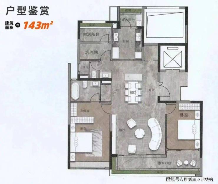 明星户型2:143㎡四房三卫(双套房设计,客厅6.8米开间,适合三代同堂);