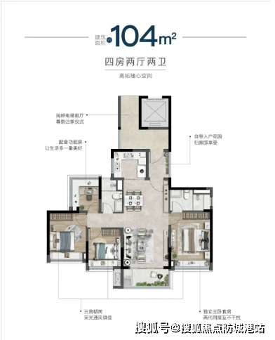 104㎡四房:四开间朝南,独立入户花园,私密性高;