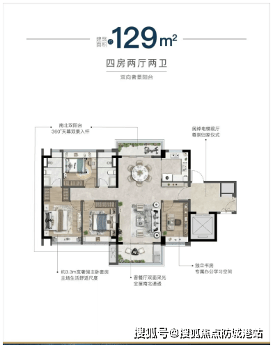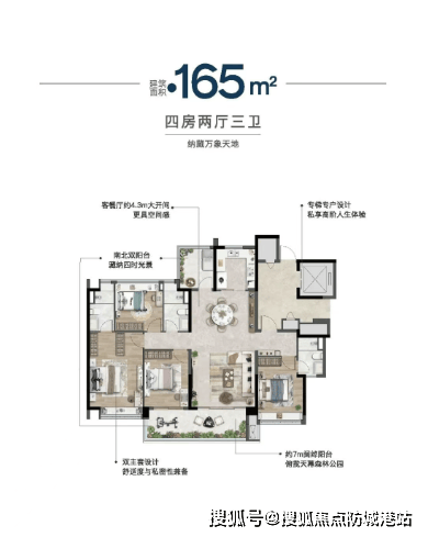 168㎡四房:两梯两户,双主套设计,电梯厅面积达15㎡,阳台长7米。