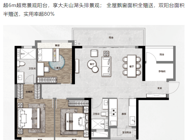 125㎡四房两厅两卫:这是板块内唯一的正南北横厅户型,客餐厅一体,明亮阔绰;超6m的超宽景观阳台,可享受大夫山湖头排景观。