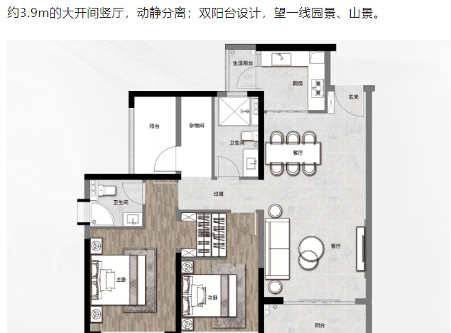 105㎡三房两厅两卫:此户型是板块内唯一的纯南向且三开间朝南的三房户型,超宽楼距,视野开阔;双阳台设计,可欣赏一线园景、山景。