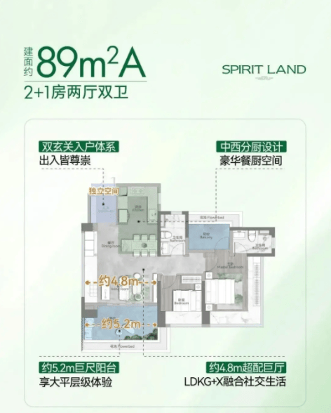 89㎡的三房两厅两卫非常适合刚需小家庭。该项目做到了内外双玄关和 LDKG+X 一体化设计,客餐厅开间达到 4.8 米,空间感极强。主卧面积约 28㎡,还带有 270°全景飘窗,采光和视野俱佳。这种设计不仅提升了居住的舒适度,还增加了空间的实用性。