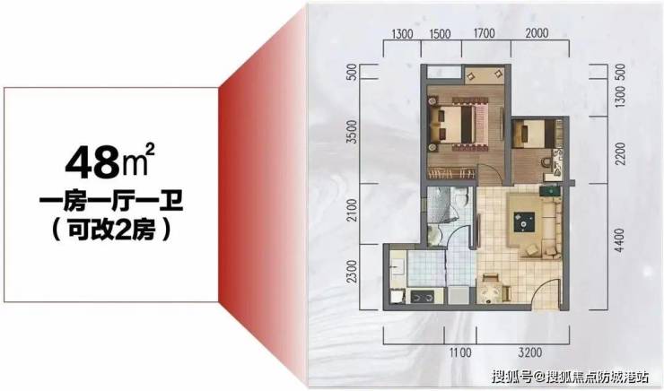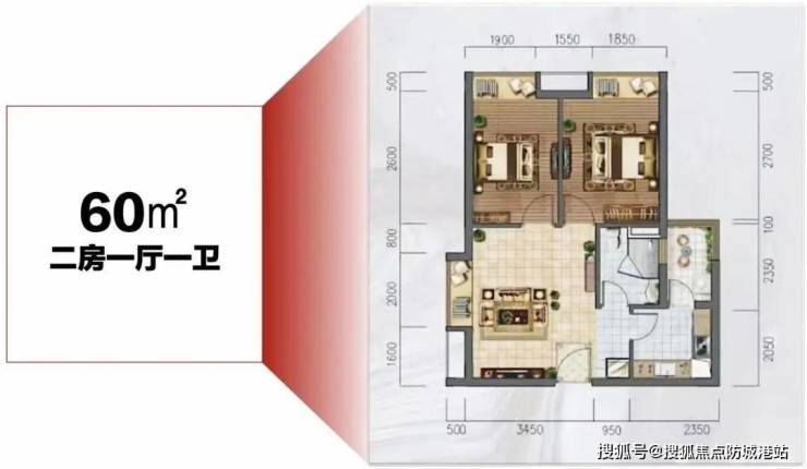 两房户型设计紧凑实用,空间布局合理,功能分区明确。客厅与餐厅相连,形成一个宽敞的公共活动区域,适合年轻夫妻或单身人士居住。卧室面积适中,采光通风良好,为居住者提供了一个舒适的休息空间。