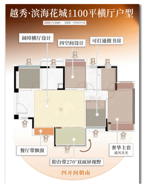 约100㎡户型,是全盘最抢手的面积段,分为横厅和竖厅两种格局,均为单边位,通风和采光接近板楼,目前已升级至3.0新规版。横厅四房格局,阳台做到270°视野,还设有餐边飘台,既能扩大室内景观面,又能增加收纳和赏景功能;竖厅主打实用性,动静分区合理,公区同样采用LDKB设计,父母在厨房烹饪时也能照看客餐厅的小孩,实现更多生活场景的演绎。