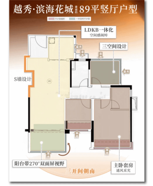 约89㎡3室2厅2卫,采用新规设计,打造三个270°视野(景观阳台、主卧和次卧),同时配备主套,全屋多飘窗设计,采光与通透性极佳,空间灵动,利用率高,搭配LDKB设计,提升居住舒适度与实用性,贴合改善型群体的居住需求。