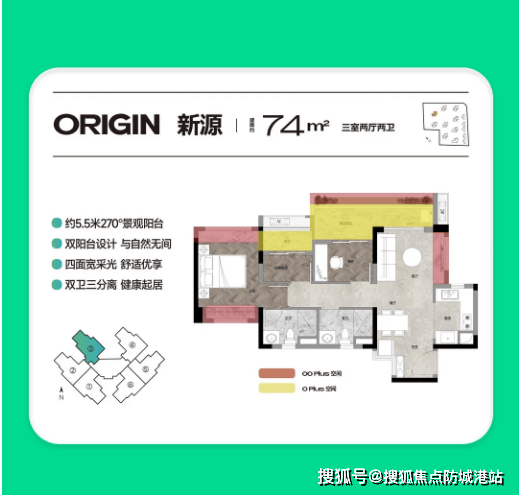 【约74㎡3房2厅真2卫】:该户型为刚需入门首选,卷出天际的实用设计,完美适配三口之家居住。户型配备5.5米大阳台,270°无敌视野,推窗即可欣赏社区园林美景,同时阳台空间宽敞,可兼顾休闲、晾晒等多种功能,实用性拉满;三房真两卫设计,彻底解决了家人刷牙如厕排队的困扰,提升居住便捷度,适合人口较多的刚需家庭;四开间采光设计,全天沐浴阳光,采光通风效果极佳,室内空间明亮通透,告别阴暗潮湿,提升居住舒适度;超83%标准层实用率,空间布局合理,无浪费面积,每一寸空间都得到充分利用,性价比极高。