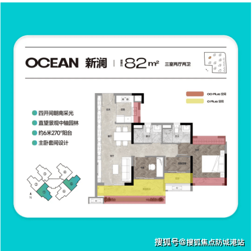 【约82㎡3房2厅2卫】:该户型为南向看山户型,主打舒适刚需,适配对居住舒适度有一定要求的刚需群体。户型配备6米大阳台,270°南望中轴园林,推窗即可欣赏园林美景,高层还可眺望帽峰山,景观绝美,阳台空间宽敞,可打造休闲区、晾晒区,兼顾实用性与观赏性;四开间朝南设计,全天沐浴阳光,采光通风效果极佳,室内空间明亮通透,南北通透,居住舒适度拉满;主卧配备双飘窗,增加了空间的延展性,同时可作为休闲、储物空间,实用性极强,主卧空间宽敞,私密性好,能够满足业主的居住需求,适合三口之家或改善型刚需家庭居住。