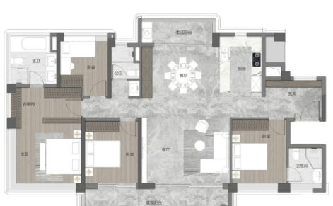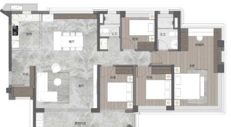 195平大四房:阳台长度约8米,LDK客餐厅面积达70+平方米,两侧观江面加起来长达约16米,堪比酒店的江景宴会厅。