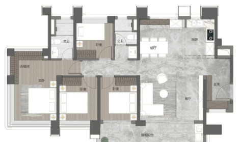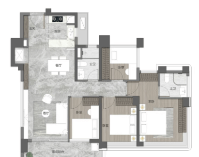 95平南向三房:客餐厅和阳台开间达到5.6米,主卧套房设计,带270°大飘窗,也可改四房。