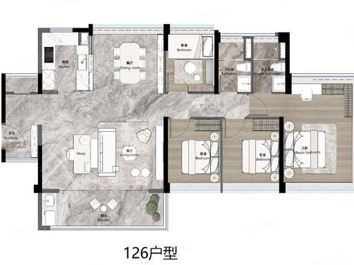 126㎡ 五房两厅两卫(奢阔):片区稀缺五房,堪比 160㎡大平层体验。超 130% 使用率,南北对流,豪华横厅设计,全明户型,多代同堂或二胎家庭首选。