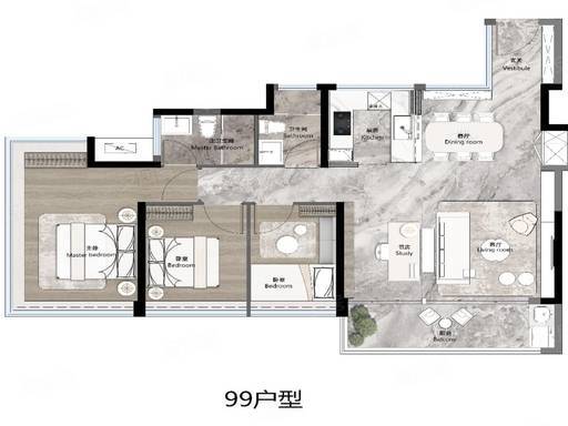 99㎡ 3+1 房两厅两卫(主力):经典 “3+1” 灵动户型,五开间朝南,约 5.3 米 IMAX 宽景阳台。独立多功能室可改书房、儿童房,满足成长型家庭需求。主卧套房设计,舒适度拉满。