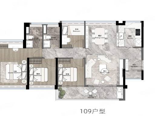 109㎡ 四房两厅两卫(改善):纯正南北通透,LDKB 一体化设计(客厅、餐厅、厨房、阳台连通),空间开阔。入户独立玄关 +“800 库” 超强收纳,三间卧室朝南,约 6.4 米巨幕阳台,改善一步到位。