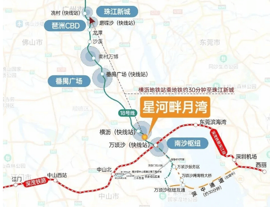 项目交通优势突出,紧邻地铁 18 号线(时速 160km/h,中国最快地铁之一),虽需接驳但 1 站可达番禺广场、2 站琶洲、3 站直达珠江新城,快速连接广州核心区域;未来 18 号线南延段规划通达中山、珠海,湾区通勤更便捷。自驾出行依托门前灵新大道(南沙第二条主轴),距离南沙枢纽站仅约 5 公里(深江高铁在建接入),深中通道广州出入口近在咫尺,轻松实现 “1 小时湾区生活圈”。此外,首批交楼后将开通免费业主楼巴,进一步提升出行便利性。