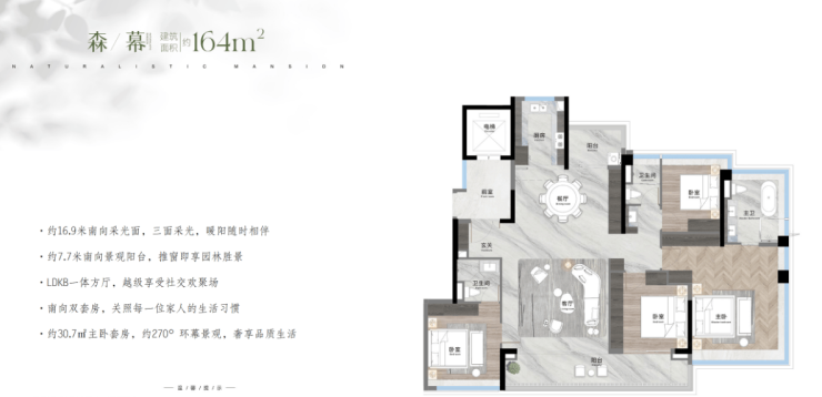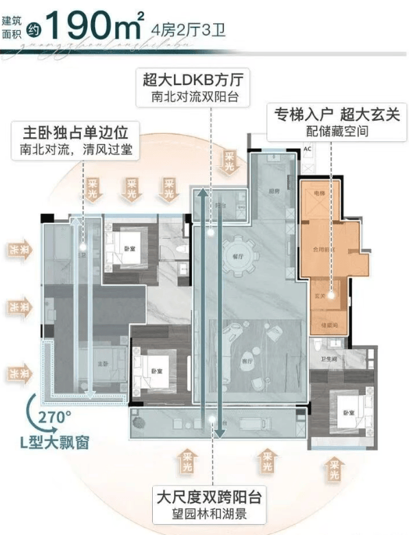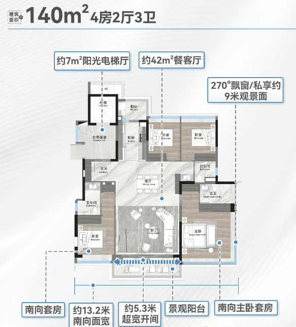 越秀观樾分为南北两个地块,南侧地块分布20栋住宅,北侧地块分布5栋住宅。在售户型面积段从125平方米到250平方米不等,均为低密度板楼设计,享有中轴园林景观。其中,140平方米户型强调超高使用率和空间灵动性;190平方米户型拥有全屋高窗地比和超大飘窗设计;250平方米户型则具备奢阔层高和巨厅设计,适合追求高品质生活的家庭用户。