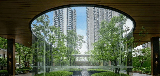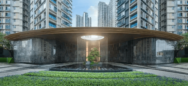 A:社区大门横跨约61米,中间环绕一圈朦胧水幕,正中央挺立一棵罗汉松,据说价值200万元。这种设计不仅增强了视觉冲击力,也象征着财富与吉祥,体现了项目的高端定位与文化内涵。