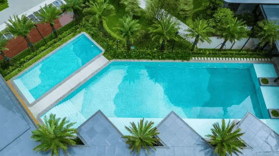 归家途中,经过一片精心设计的浮岛森林,8棵优雅的乌桕树向上生长,展现出旺盛的生命力,仿佛为疲惫的心灵注入一丝宁静。这片区域不仅美化了社区环境,更成为居民日常散步、放松身心的理想场所。而在社区中心位置,一座Tiffany蓝玻璃泳池格外引人注目,四周种植银海枣、红花玉蕊等热带植物,营造出浓郁的度假风情。参考三亚奢华酒店Edition的设计理念,泳池区域设有休闲假日生活馆,供居民夏日游泳、午后小憩,享受宛如度假般的奇妙体验。