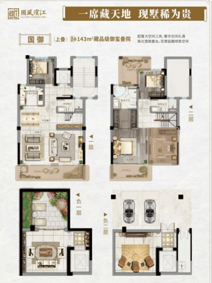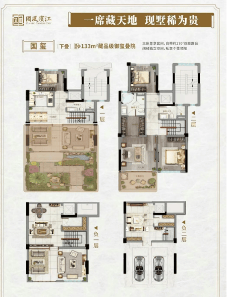 户型方面,主推建面约 133/143㎡中心江岸联排院墅,实用率最高达 276%,拓展空间充足:可打造家庭影院、酒窖、棋牌室等个性化功能区,适配多代同堂或高端社交需求;墅级双会客厅设计,大尺度采光面让空间更通透,江景与园景可自然融入室内;内部空间布局合理,动静分区明确,主卧套间配备独立卫浴与衣帽间,细节处凸显舒适感,远超传统大平层的单层空间体验。