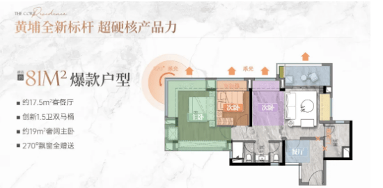 【主力户型详解】建面约81㎡三房一卫户型,东北向布局,适配刚需家庭。该户型做到了三房设计,空间紧凑实用,主卧配备270度飘窗,增加了空间通透性与采光效果,同时提升了景观观赏性。厨房采用U型设计,操作空间充足,满足日常烹饪需求,整体布局合理,无浪费空间。