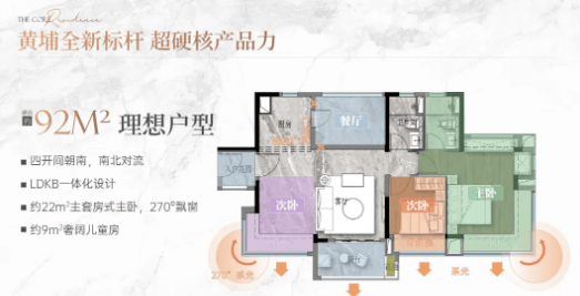 建面约92㎡三房两卫户型,南北通透设计,全盘仅约88套,稀缺性较强。该户型布局方正,动静分区明确,客厅与餐厅相连,营造出开阔的公共空间;主卧同样配备270度飘窗与独立卫生间,居住舒适度高,适合追求品质生活的改善家庭。